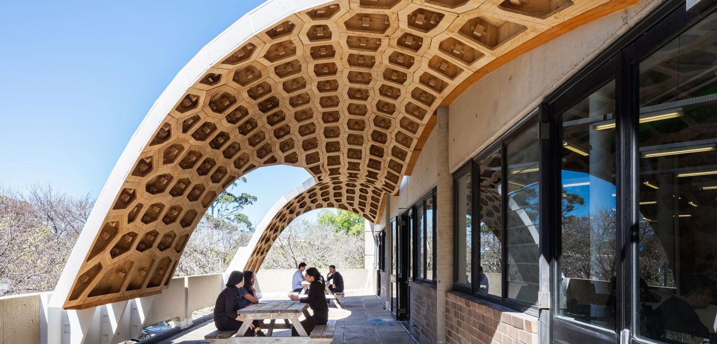 Installed on the terrace of the Wilkinson Building, the HexBox canopy provides students with shaded outdoor space while serving as a full-scale demonstration of digital fabrication and timber engineering.