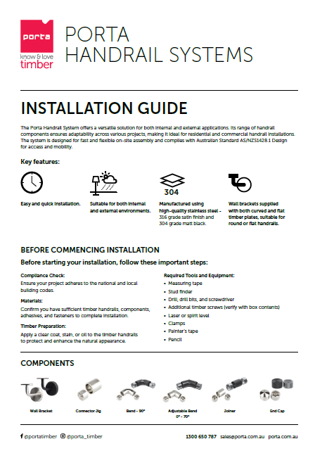 Porta Handrail System commercial grade satin-finish 316 stainless steel fittings are compliant to Residential (NCC Vol 2: Class 1 & 10) and Commercial (NCC Vol 1: Class 2 and NCC Class 3/9a Aged Care Facilities) requirements. Materials listed to be supplied to specified areas, or otherwise quantified.